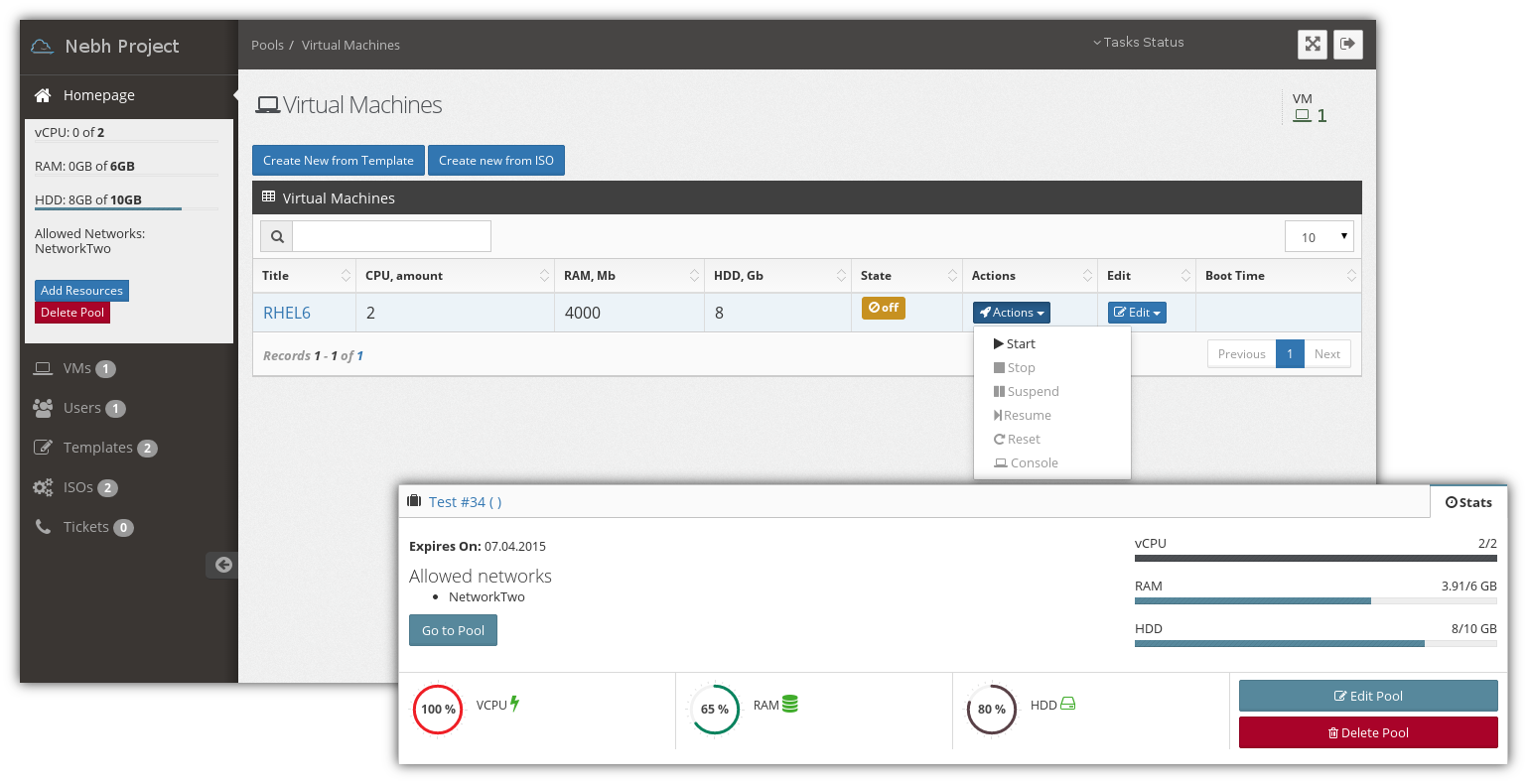 Nebvex allows its users to manage virtual resources in accordance with the regulations specific to each individual enterprise, therefore, offering an improvement over the Amazon cloud solutions and similar. Nebvex private cloud solution can be deployed on your existing virtual infrastructure.